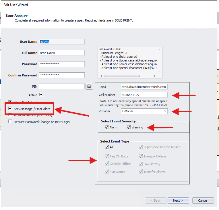 On the edit user wizard, you will check the box marked "SMS Message / Email Alert".